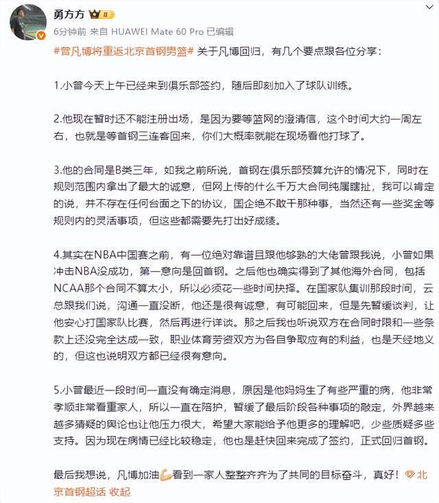 首钢俱乐部还解释了为何曾凡博这么久才回归,曾凡博家中突发特殊情况,急需凡博返家处理,双方商议后延长了商谈时间。目前,曾凡博已经和北京男篮一起训练,但是还不能代表北京男篮出战,要等NBA篮网队的澄清信,这个时间大约一周左右,预计三连客结束后,曾凡博就可以出战了。