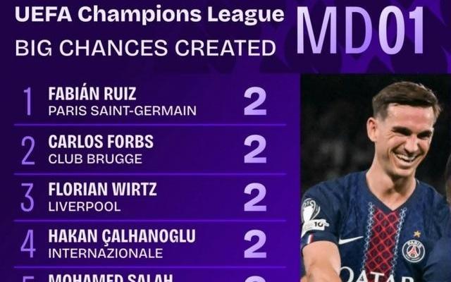 欧冠首轮创造机会榜:福登8次领跑,姆巴佩6次、维尔茨5次