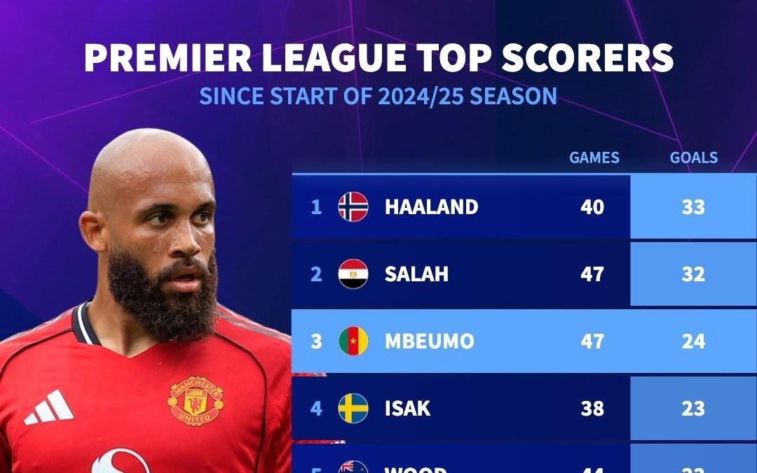 上赛季至今英超进球数前10:哈兰德、萨拉赫前2,姆伯莫第3